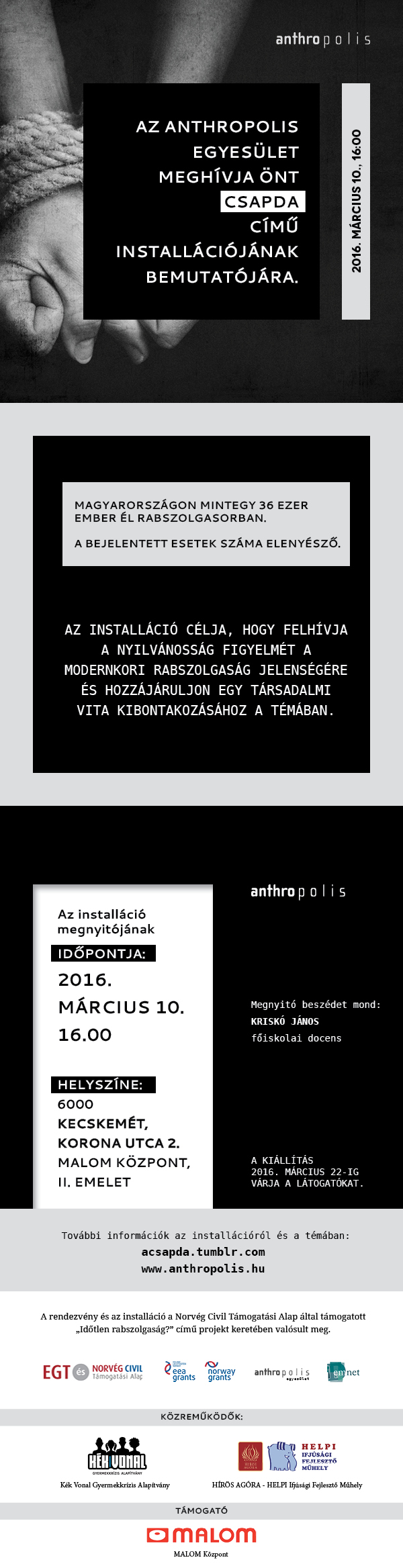 A rendezvény és az installáció a Norvég Civil Támogatási Alap által támogatott “Időtlen rabszolgaság?” című projekt keretében valósult meg.